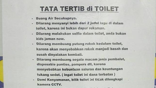 Nah, dengan ulah pengguna toilet yang kadang menyebalkan ini para petugas kebersihan membuat tata tertib, sebagai alarm dan pengingat. Lah, masalahnya, beberapa aturan kadang nyeleneh dan membuat ngakak berkepanjangan. Seperti 12 aturan dalam toilet ini nih!
