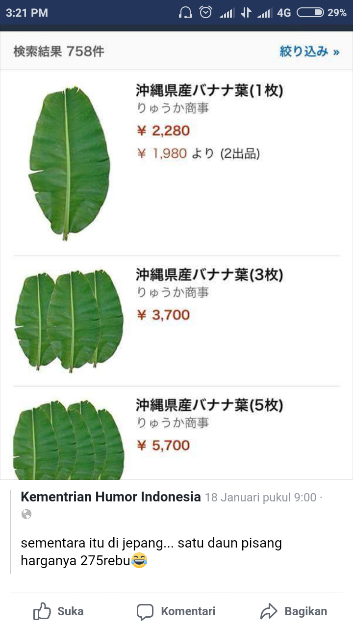 Situs Amazon yang jajakan daun Pisang [Sumber gambar]Semua orang tau kalau di Indonesia daun pisang biasanya dijadikan sebagai bungkus nasi alias enggak ada harganya sama sekali. Kamu bisa mengambil di kebun, atau minta daun tetangga jika diperlukan. Ada sih beberapa pasar tradisional Indonesia yang menjual daun pisang, harganya sangat bersahabat, hanya 2 ribu rupiah per kilogram. Namun, beda halnya di negeri Sakura, walaupun pisang merupakan buah populer yang mudah ditemukan, daunnya sangatlah susah untuk didapatkan. Beberapa situs jual beli online memperdagangkan daun ini dengan harga yang sangat mahal. Per lembar daun pisang dihargai 273 ribu rupiah, berjualan daun ini di sana mungkin bisa cepat jadi jutawan.