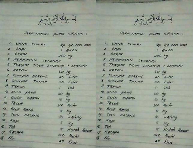Berdasarkan sebuah postingan sebuah akun twitter dengan @jurilagu, sebuah gambar unggahannya menghebohkan netizen. Pasalnya gambar tersebut menunjukkan begitu mahalnya sebuah mahar yang diberikan oleh pihak istri dan keluarganya pada calon suami. Bukan main, bahkan sampai dengan nominal Rp 179 juta. Miris, mengingat ternyata uang yang ada dimiliki oleh si calon mempelai pria hanya Rp 1,1 juta saja.