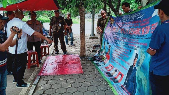 Spanduk yang diturunkan [sumber gambar]Jadi, menurut orang terdekat Raja ‘King of The King’, sang raja yang sering disapa Mister Dony Pedro ini merupakan orang yang punya kekuasaan paling tinggi di dunia ini. Istilahnya sih Raja Diraja. Nah, salah satu hal yang bisa dilakukan oleh sang raja adalah melantik dari seluruh presiden dan raja-raja di seluruh dunia. Awas, ntar diajak duel Donald Trump loh, Pak Dony.