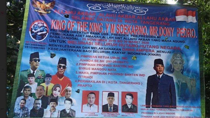 Spanduk King of The King [sumber gambar]Janjinya sama seperti kerajaan lain sih, membuat masyarakat Indonesia sejahtera. Misi tersebut ditulis besar di spanduk. Selain ‘King of The King. YM Soekarno. Mr. Dony Pedro’, ada lagi tulisan yang mengklaim bahwa kerajaan tersebut akan bekerja sama dengan Presiden Direktur Bank UBS, Presiden PBB, Presiden MI, yang disebut terbentuk untuk melunasi utang negara, seperti dilansir dari vivanews.com. Orang-orang yang mengaku raja, sultan, entah apalah itu namanya ini, apa mereka enggak bosan ya berurusan dengan polisi?